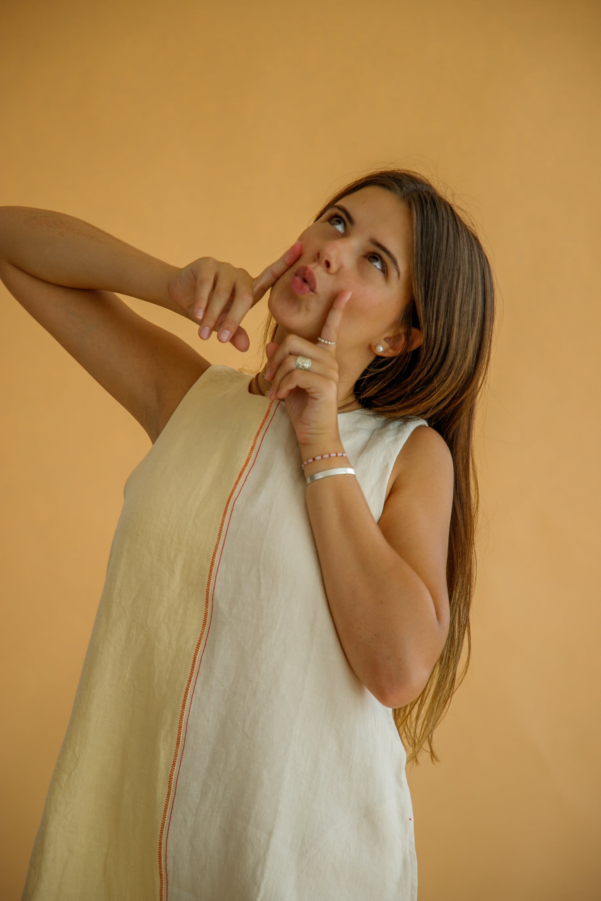 Vestido de lino combinado, corte A-line, silueta cómoda con bolsillos.